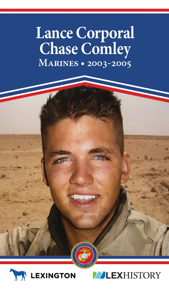 Born on November 10, 1983, Chase Comley graduated from the Sayre School in 2002. He enlisted in the Marines in 2004 and served in the 2nd Platoon, B Company, 2nd Assault Amphibian Battalion and was deployed to Iraq in Operation Iraqi Freedom. He was killed in action by a suicide bomber in Al Amiriyah, Iraq, on August 6, 2005, while performing combat operations.